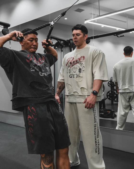 LÝFT × Power House Gymコラボ限定グラフィックをフロントにプリントし、裾部分にダメージレイヤード風の加工が施されたTシャツ。